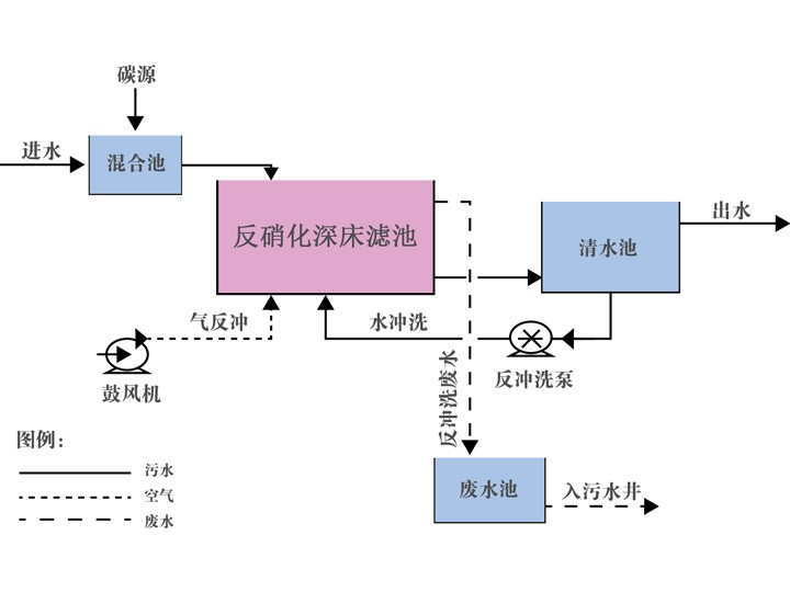 反硝化深床滤池上实质是一种填充式的固定膜反应器。它是与给水过滤相结合的一种生物膜法废水处理工艺,属于生物过滤技术。细菌和其它微生物以一层薄膜生长在固体介质上,当流体在固体滤料上流过时,利用滤料的拦截和滤料上生物膜的生物降解双重作用来将污染物加以去除。