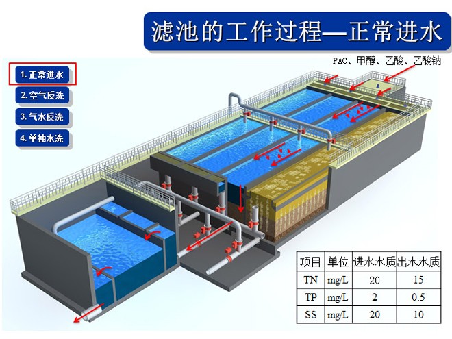 运行模式在外加碳源情况下,则为具有反硝化功能的深床反硝化滤池,可以去除 TN、SS 和 TP。取消外加碳源情况下,则为深床滤池,可以同时去除SS和TP。