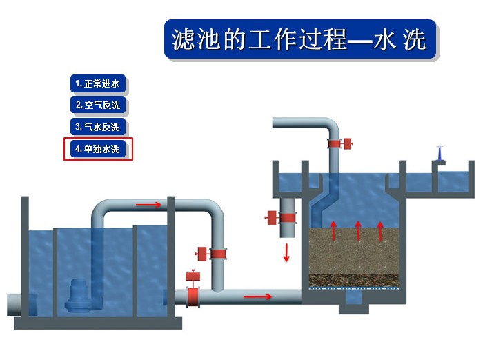 1、气水联合反冲冼装置、布气装置、操作工艺等系统集成技术解决直接过滤、生物滤池生物膜脱落堵塞滤池的问题。
